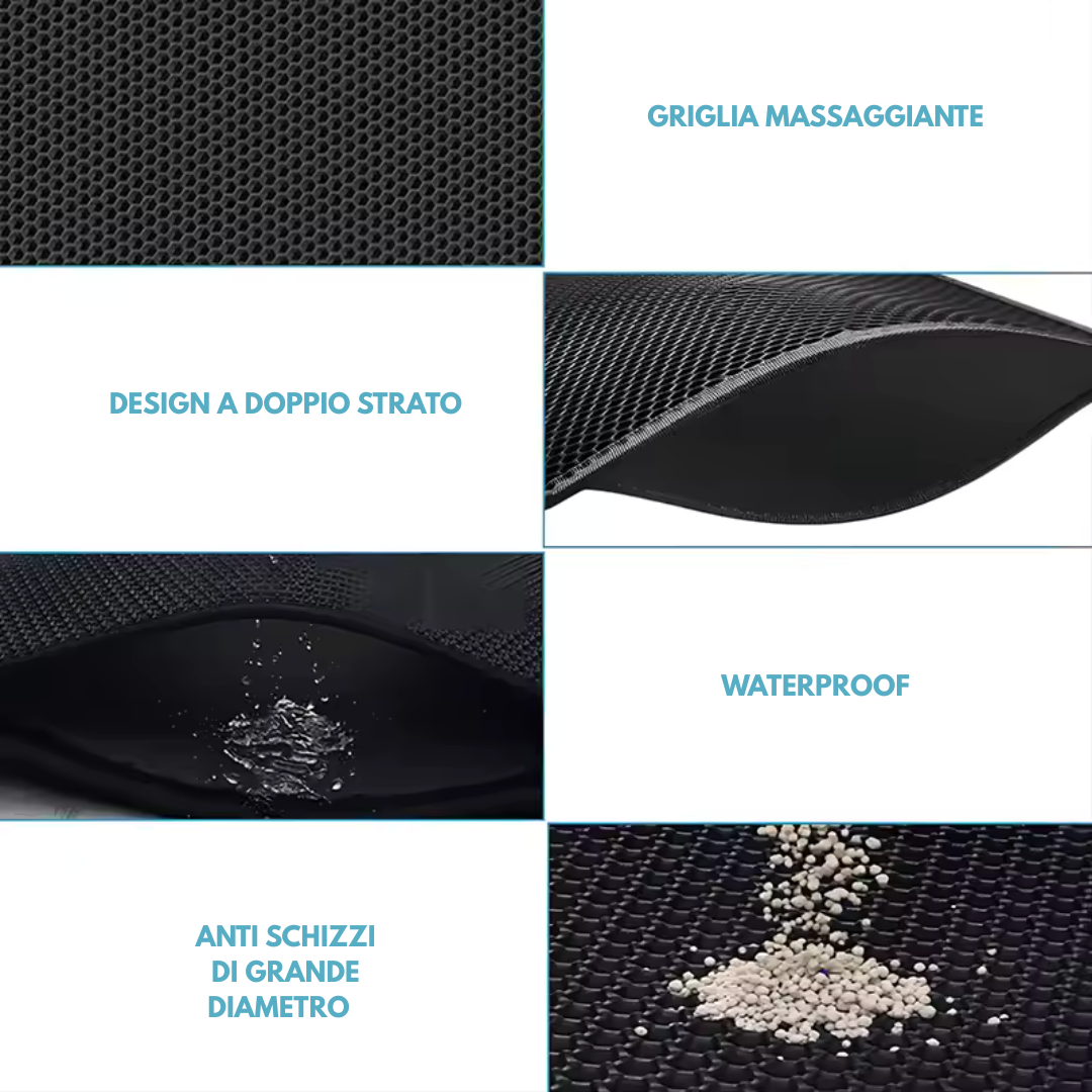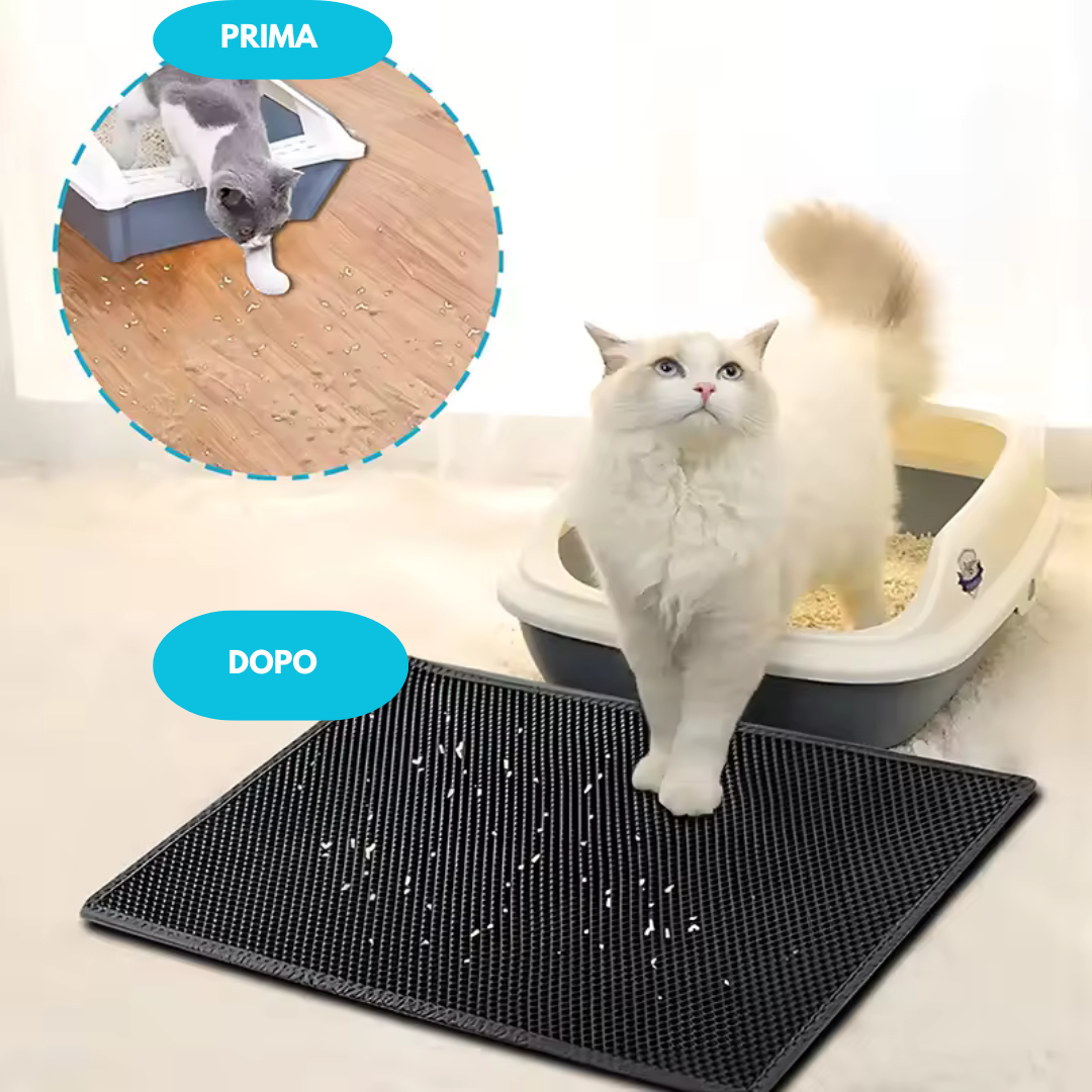 Il doppio strato trattiene ogni granello: la lettiera resta nel tappetino, non sul tuo pavimento.